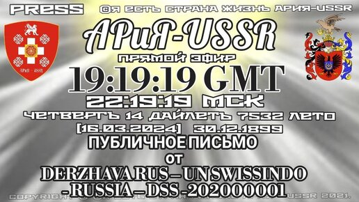 ПрямойЭФИР АРиЯ-USSR [16.03.2024]ПУБЛИЧНОЕ ПИСЬМО от DERZHAVA RUS-UN SWISSINDO-RUSSIA-DSS-202000001