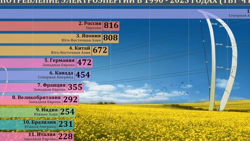 ТОП стран - крупнейших потребителей электроэнергии с 1990 года по 2023 год включительно