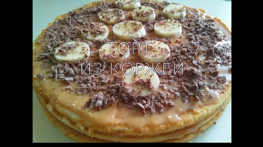 Торт из готовых бисквитных коржей с бананом и сгущенкой. Очень вкусный торт. Готовится легко.