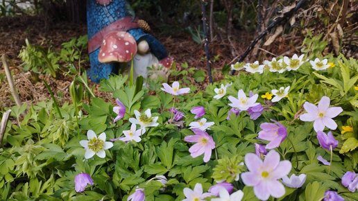 Анемоны Blue eyes, Kentrish pink, Green fingers, Hiiumaa в саду Гриндачи в 2023 году.
