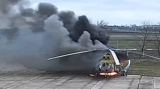 Первые кадры удара, предположительно, украинского дрона-камикадзе по транспортному вертолёту Ми-8МТ