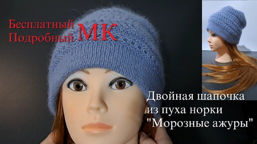 Двойная шапочка из пуха норки "Морозные ажуры". БЕСПЛАТНЫЙ ПОДРОБНЫЙ МК. Спицы. Удобная и стильная модель женской вязаной шапки бини.