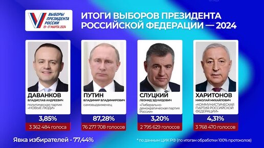 Путин набрал 87,28% голосов избирателей по итогам подсчёта 100% протоколов