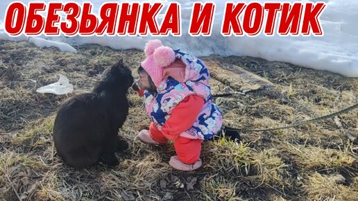 Маленькая домашняя обезьянка Алекса и очень смелый котик!