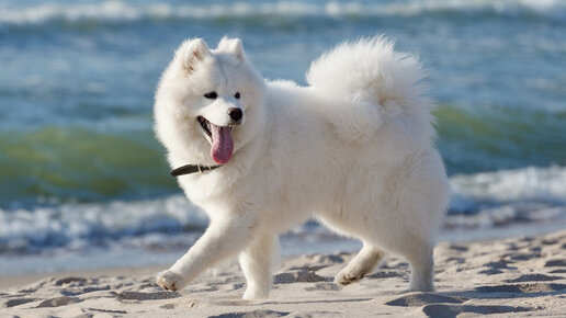 Собака самоед на море в Сочи на пляже