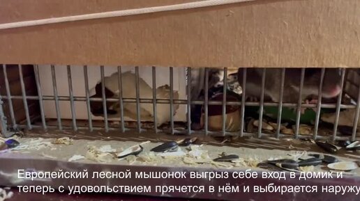 Европейский лесной мышонок выгрыз себе вход в домик и теперь с удовольствием прячется в нём и выбирается наружу