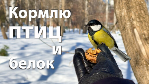 Кормлю белок и птиц. Белка пытается забрать шишку у другой.