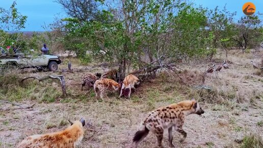 Стая гиен отбила своего собрата от голодного льва