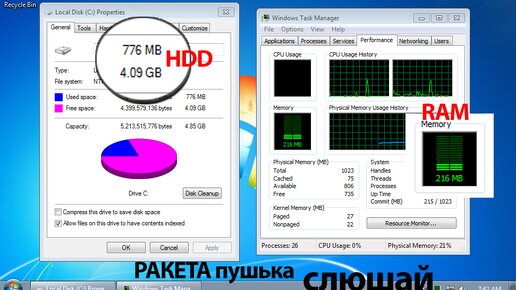 Windows 7 размером 300 МБ, в ОЗУ 200 МБ
