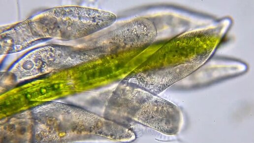 Инфузории окружили диатомовую водоросль, но в силу размера, высосать ее они не смогут
