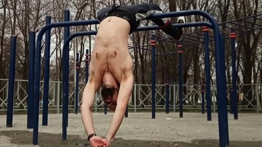 делаю глубокую растяжку для спины на брусьях в парке