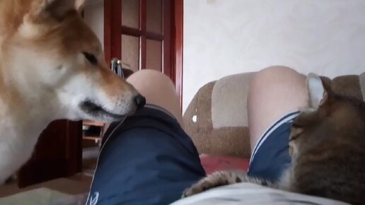 Бася пытается прогнать Семена, сначала с хозяина, потом с дивана. Ох уж эта ревность.