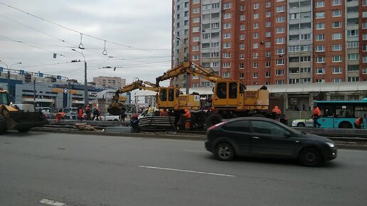 Экскаватор едет по трамвайным рельсам для укладки асфальта на платформу.