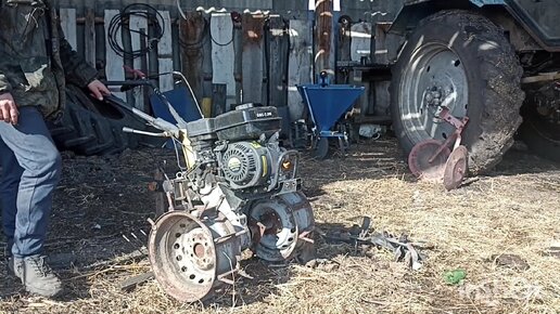 Запуск после зимней спячки. Мотоблок Хутер запустился с трудом. Агрегаты после обработки одного га.