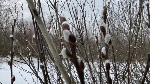 Весенние пейзажи Подмосковья, снега в полях много , на иве распустились белые почки. Конец марта
