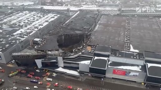 Огромную воронку на месте обрушившейся кровли «Крокус Сити Холл» после теракта сняли с воздуха