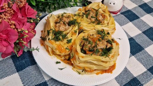Гнезда из макарон с фаршем на сковороде. Оригинальный рецепт ужина для всей семьи.