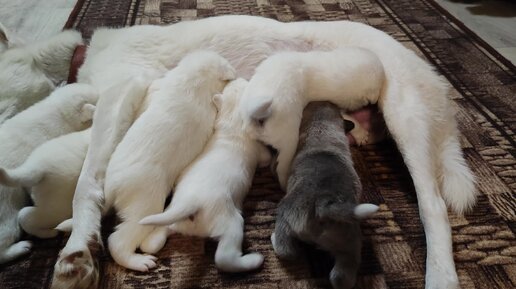 Две недели после рождения. Шестеро щенят. Лакомиться молоком