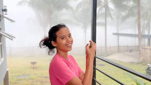 Сильный туман окутал наш участок, ничего не видим. Найви ест сладкую картошку странным образом