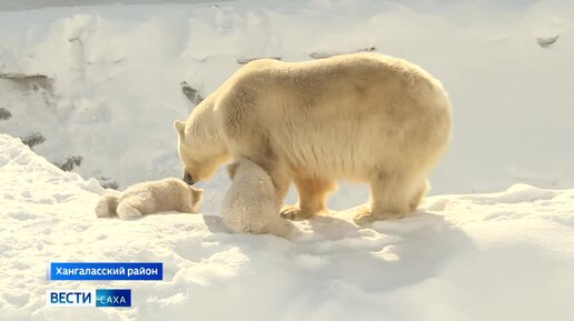 Белая медведица Колымана впервые вывела своих детей на прогулку