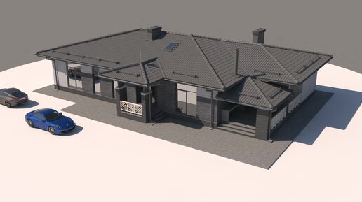 Проект одноэтажного дома "БУМЕР" 200 м2 в стиле Райта из керамоблока 510 мм и облицовкой лонг брик