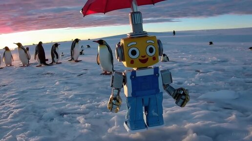 Синий игрушечный робот, гуляет в АНТАРКТИДЕ на закате.