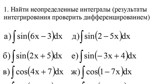 Найти неопределенные интегралы а) ∫sin(6x−3)dx, б) ∫sin(2x+5)dx, в) ∫cos(4x+7)dx, г) ∫cos(2x−3)dx, д) ∫sin(2−5x)dx, е) ∫sin(−3x+4)dx