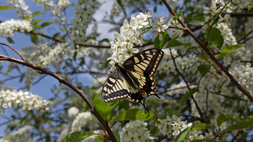 Бабочка махаон на цветущей черёмухе.