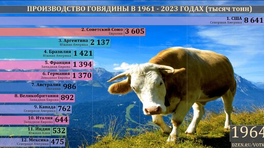Крупнейшие страны-производители говядины с 1961 года по 2023 год включительно