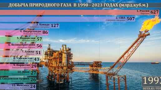 Крупнейшие страны по добыче природного газа с 1990 года по 2023 год включительно