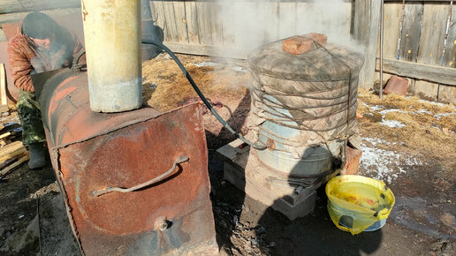 Ребята топят серу (смолка) лиственницы. Год спустя. Агрегат для топки серы усовершенствовали.