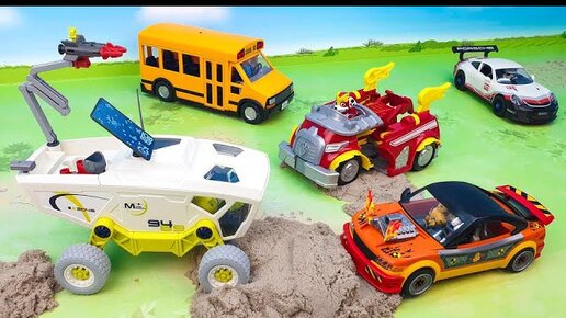 Пожарная машина Экскаватор Школьный автобус Полицейская машина Луноход и Щенячий Патруль распаковка