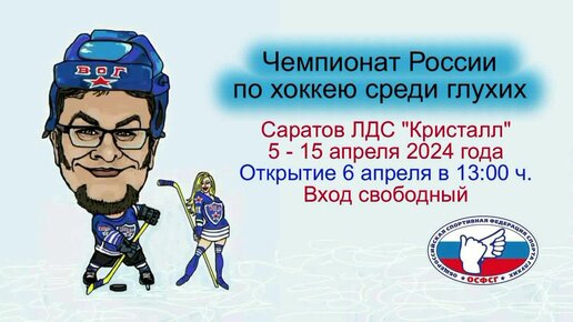 ЧЕМПИОНАТ РОССИИ ПО ХОККЕЮ С ШАЙБОЙ СРЕДИ ГЛУХИХ С 5 ПО 15 АПРЕЛЯ 2024 ГОДА. ОТКРЫТИЕ 6 АПРЕЛЯ В 13-00 в ЛДС "КРИСТАЛЛ" г. САРАТОВ.