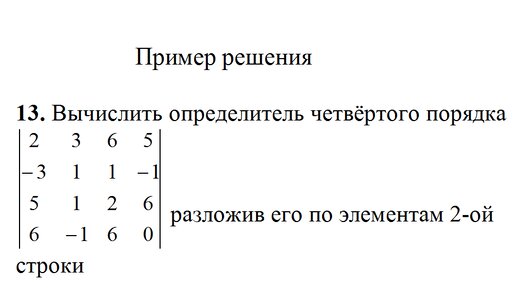 Вычислить определитель матрицы четвертого порядка (2 3 6 5; −3 1 1 −1; 5 1 2 6; 6 −1 6 0) разложив его по элементам 2-й строки. Пример 13