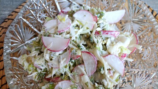 Салат капустный с весенним редисом и зелёным горошком. Сочный, хрустящий салат.
