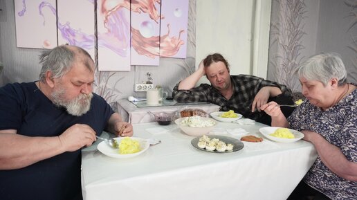 ОБЕД В СЕМЬЕ С ПЮРЕШЕЧКОЙ И САЛАТИКОМ ТАК ВКУСНО КУШАЕТ ДЕРЕВЕНСКАЯ СЕМЬЯ