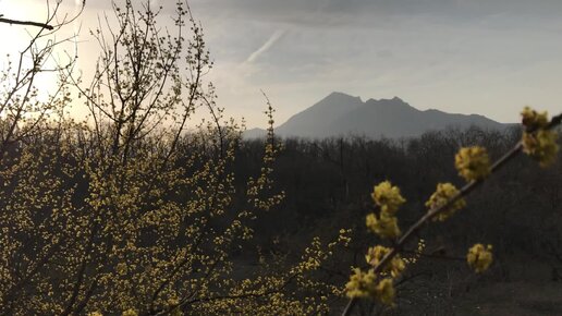 Цветение кизила на Перкальской скале (Машук, Пятигорск, вид на Бештау)