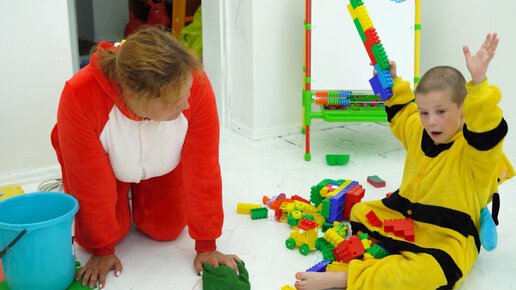 Ребенок играет с конструктором мама моет полы и разлила воду из ведра на пол