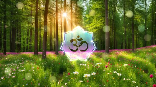 Красивая расслабляющая мелодия. Символ ОМ на фоне зеленых пейзажей.
