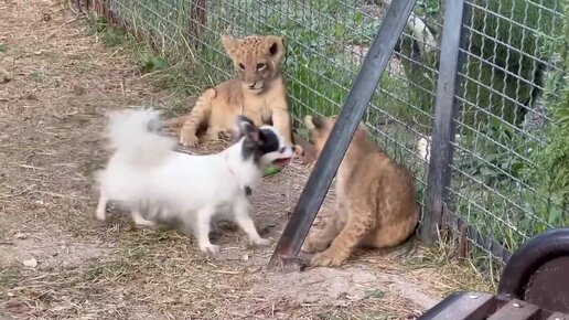 Львы и собачка! Бесстрашная малышка воспитывает львят! Fearless little dog raisi
