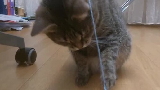Маняша помогает вязать голубую авоську. Нитки помогает разматывать.