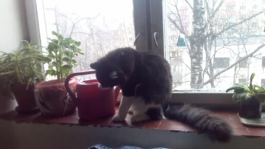 Кот научился пить из лейки