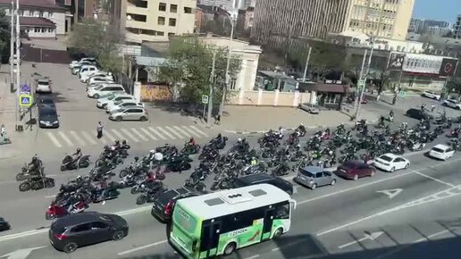 Байкеры Краснодара открыли мотосезон. Маршрут многочисленной ревущей колонны прошёл от улицы Мачуги, через центр и до Тургеневского моста.