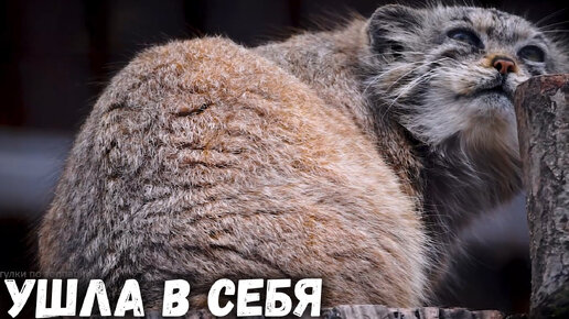 Манул Намика повернулась ко всем пушистой спинкой и умывается. Ленинградский зоопарк