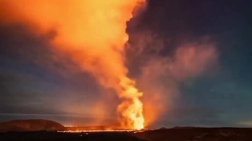 Полярное сияние над извергающимся вулканом в Исландии, близ Гриндавика