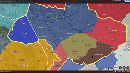 7 апреля. И никем непризнанные. ЗУНР, УНР ( Петлюра ), Махновцы, Григорьевцы, Красная УНРС, Антанта, и их зоны контроля в 1918 году.