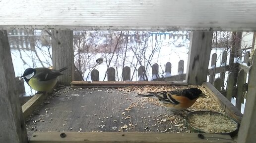 Вьюрок на кормушке. Очень любит шинкованные орешки