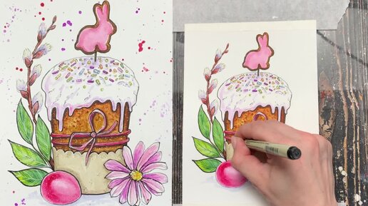 УРОК ПАСХАЛЬНЫЙ КУЛИЧ С КРОЛИКОМ. БЫСТРО, ПРОСТО И ДЛЯ НАЧИНАЮЩИХ. АКВАРЕЛЬНЫЙ СКЕТЧИНГ