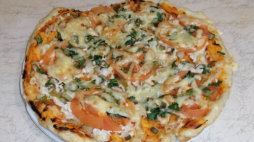Пицца на слоёном корже с курицей, помидорами и солёными огурцами