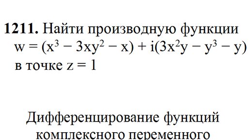 1211. Найти производную функции w=(x^3−3xy^2−x)+i(3x^2y−y^3−y) в точке z=1 (ТПУ, МГУ)